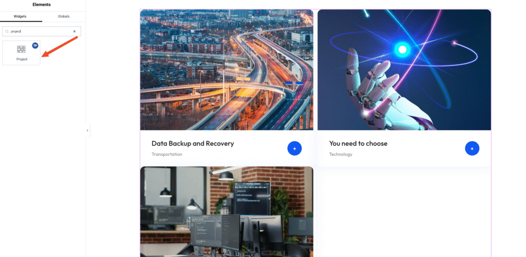 • Search for “Project” in the Elementor widget panel.